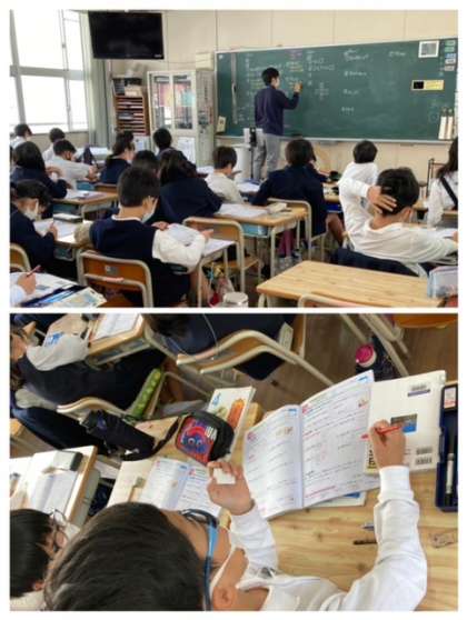 算数のようすです。計算の決まりを使っていかに簡単に計算することができるかを考えていました。