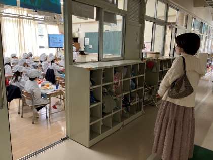 お揃いの給食着で給食室に向かう姿はとても可愛らしく、どの学年の子どもたちも先生からの指導を守って一方通行で部屋に戻り、黙食で食べている姿は寂しくもあり感心しました。