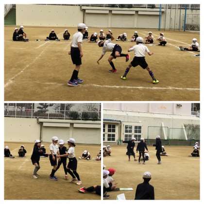 体育で取り組んでいたグループに分かれての創作ダンスの発表会をしていました。