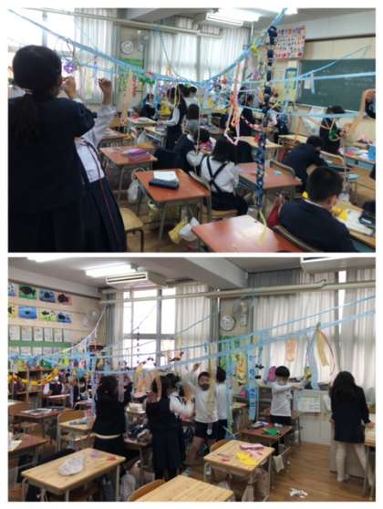 図工の時間につないでつないで、教室いっぱいの大きな作品をみんなで作り上げていました。