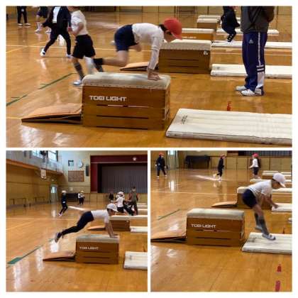 体育ではとびばこをしています。手をつく場所や腰の跳ね上げ方。ひとつひとつ確かめながら跳ぶ練習をしています。