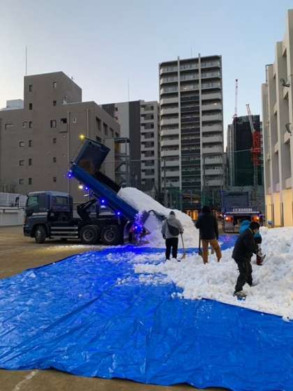 お手伝いの第一陣は朝の6:30から、(ソフトボール部を含む)PTAのお父さんたちだけでなく、青少年指導員という地域の方々のお手伝いもいただいて、10tトラック3台から降ろされた雪をみんなが遊べるように均し、一生懸命準備しました。