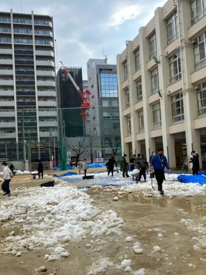 その後には昼休憩を挟んで、中大江幼稚園PTAの保護者の方も交えて月曜日の中大江幼稚園での雪遊びに備えて雪を移動させるとともに、残りの雪の処分をしたのですが…これが本当に最後の最後まで大変でした。