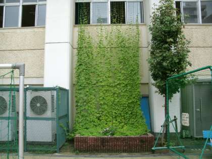 運動場に面する講堂の壁面に、毎年この時期になるとゴーヤのツルが長く伸びて沢山の葉を繁らせています。これは大阪市が壁面緑化事業として、平成21年度より市内の小中学校の壁面を利用して年々気温上昇が続く都市部のヒートアイランド現象の緩和を図るために、環境教育など子どもの豊かな情操の育成に役立て、地域に貢献する学校づくりとして取り組んできました。