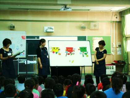 その活動は課業中にとどまらず、夏休み中の今日もまた、多目的室では夏休みに登校しているいきいき活動の児童や中大江幼稚園の預かり保育の園児を対象に「夏休みパネルシアター」が開催されました。