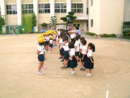 午前10時頃、幼稚園の年長組さんや1年生の子どもたちがぞろぞろと運動場に集まってきました。何があるのか尋ねてみると、園児たちが7月の幼小プール交流のお礼を言いにきたとのこと。行儀よく丁寧にお礼を言う幼稚園児たちに対して、1年生の子どもたちの様子を見ていると、どんなふうに答えたらよいのか戸惑って照れ笑いを浮かべている子が多いようでした。