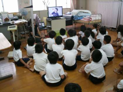 午前中、保健室では低学年の発育測定が行われていました。2年生はその際、養護教諭からビデオを使って熱中症予防の話を聞きました。ビデオの中では、運動の前後に水を飲むことで熱中症が防げるシーンがありました。これから始まる運動会の練習や地域での運動クラブ等の場面で、子どもたち自身で進んで実行できるようにしたいものです。