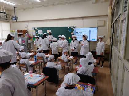 6年生が1年生の初めての学校での給食を準備しています。
