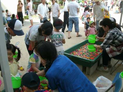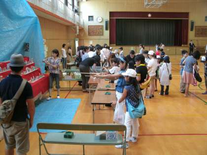 運動場では「かき氷」や「やきそば」等の飲食コーナー、ストラックアウトやスピードガン、ヨーヨーやスーパーボウルすくい等のテントがいくつも立ち並び、講堂では昔懐かしい「射的」や「輪投げ」「ウッドホッケー」等のゲームのコーナーも用意されていました。それぞれのコーナーでは、お店役のPTAや地域の方々とゲームを楽しむ子どもたちの笑顔が輝いていました。