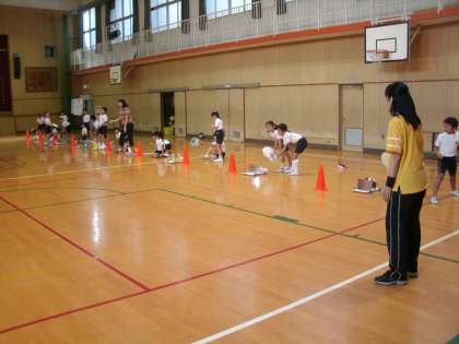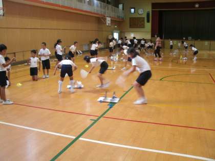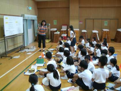 トレイや牛乳パックの帆をつけた手作りの車を団扇で煽いで速く走らせる方法をグループで話し合い、レースでタイムを計測しました。グループごとに車の違いや煽ぎ方にも個人差があり、まとめの話し合いでは様々な意見が出されました。