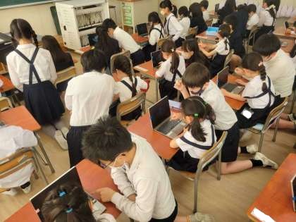 初めて使うパソコンの難しい作業に優しくつきそう6年生との姿がとても微笑ましく見えました。
