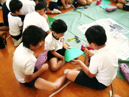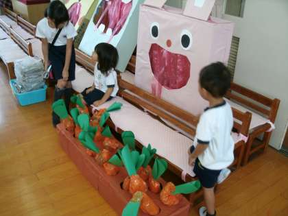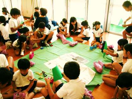 今日は4年生児童が幼稚園に行き、3・4歳児とともに「動物村のごちそうリレー」で使う道具を画用紙やセロテープなどを使って製作しました。幼稚園児と一緒に作業している4年生は普段以上に優しく笑顔が輝いていました。