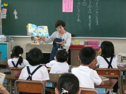 読み聞かせの内容はボランティアさんお薦めの絵本。10分程度の限られた時間内で学級により昔話あり童話あり笑い話ありの内容で、毎回どんな本に出会えるか子どもも教師も興味津々です。