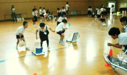 身の回りの物を使って作った風で動く車を団扇であおぎ、より速く走らせるにはどうすればよいかを予想した後、各グループで様々な実験をして確かめました。最後に全員で実験をして気づいたことやこれからどんな実験をしてみたいかなどについて話し合いを深めました。