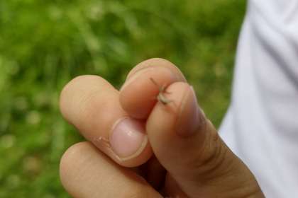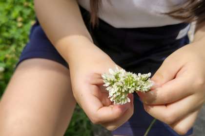 かわいい赤ちゃんバッタを捕まえたり、シロツメクサで冠を作ったりする子を発見しました。