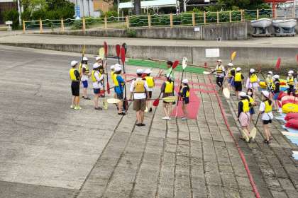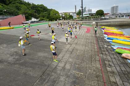カヌーのパドルを準備し、使い方の練習です。