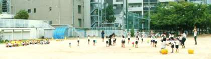 本校の運動会は中大江幼稚園と合同で行います。しかし、運動場や講堂での練習時間は小学校の予定で埋まっています。そこで今日は小学校の給食の時間を使って、幼稚園児たちが先生方に手を引かれて小学校の運動場にやってきました。自分たちが演技する運動場の位置をきょろきょろと目で確認しながら、可愛いお遊戯の練習に頑張っていました。