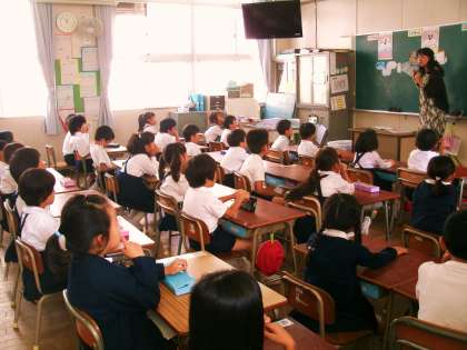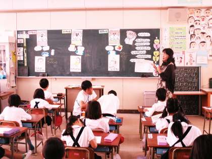 1年生の教室では米長栄養教諭(南大江小)による栄養指導が行われていました。今日の授業のために、動物の絵やことばカードなどの手作りの教材を沢山準備していただいたお陰で、子どもたちは楽しそうに笑顔を浮かべながら先生の話を聞いていました。