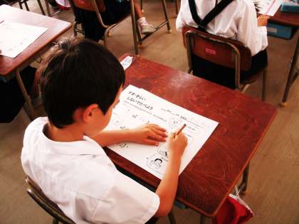 授業では、給食メニューのパン・サラダ・牛乳を食べないと、体にどんな悪い影響が出るのかを動物が登場するお話でわかりやすく説明した後、一人ひとりがプリントの問題を考えながら書き込んでいました。
