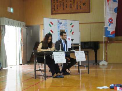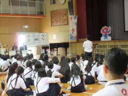 在大阪イタリア総領事館 領事部長 カルロ・ディサリオさんによる、イタリアの紹介です。イタリアの街の様子がわかる動画を見た後、イタリアの文化についてお話しいただきました。どの街にも広場(ピアッツァ)があることなど、いろいろと教えていただきました。6年生は、動画を見て気づいたことなどを発表していました。