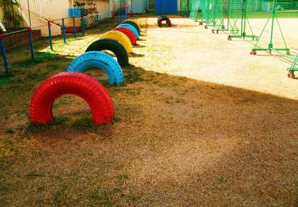 夏には青々としていた運動場の芝生も、秋の訪れとともにしだいに枯れ始めました。しかし、夏芝は宿根草のため、冬の期間は枯れていますが根はしっかりと残り、温かくなるとまた伸びてきます。