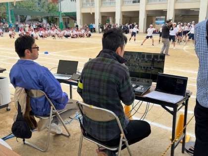 インカムで細かな指示を与えられた計4台のカメラが頑張る子ども達の姿をとらえ、その映像は、本部のパソコンでタイミング良くスイッチングされ、各ご家庭に生配信されました。