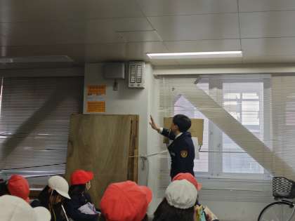 写真は,出場命令の時に光るランプについて説明していただいているところです。