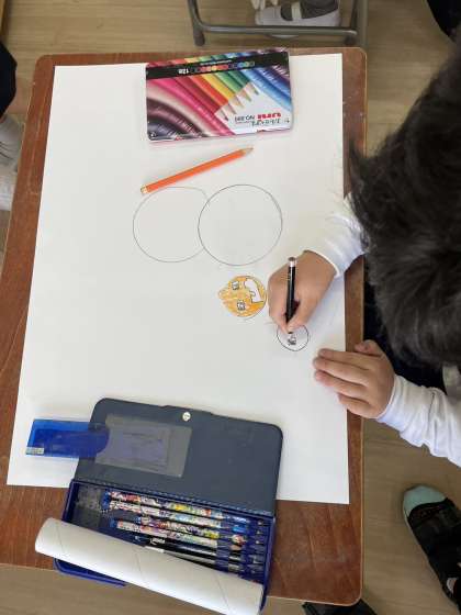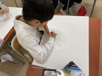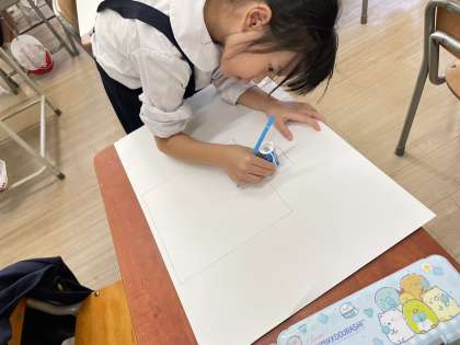 まる、しかく、さんかく、上手に組み合わせて、夢中になって楽しんで描いていました。