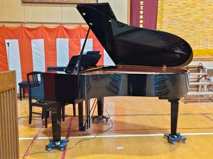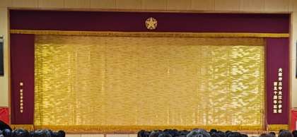 写真上・・・記念事業実行委員会より寄贈された緞帳,一文字幕,袖幕