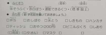 芝生でのグループ遊びやオリエンテーリングで歩くことが多いので,着脱して体温調節がしやすいように体操ズボンの上に長ズボンをはくことをお勧めします。