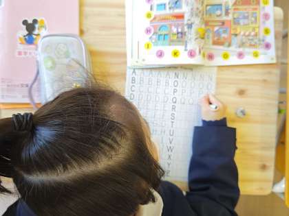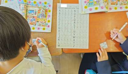 アルファベットの大文字を書く練習をしたり、BINGOゲームをしたり、先生の発音を聞いて黒板に文字を書いたりしました。