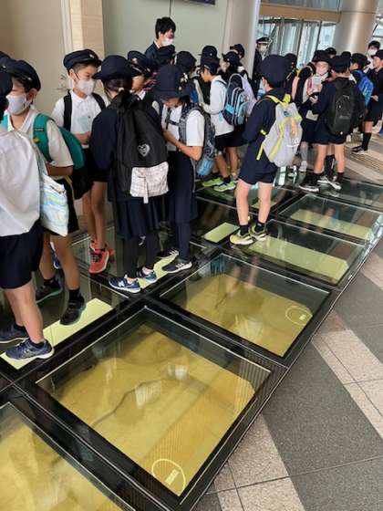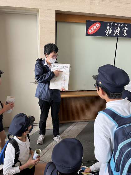 難波宮の建物の柱の跡の説明を受けた後、館内に保存されている柱の跡、館外の柱の跡を見学しました。