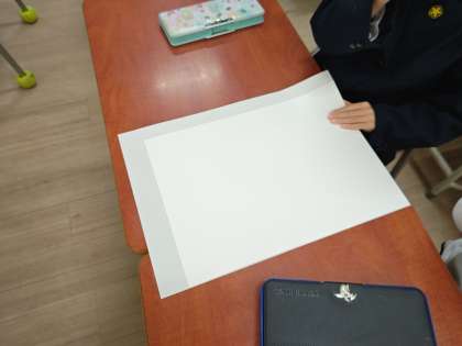 2枚目の写真は,みんなで考えた2枚の紙をきっちり重ねる方法で,紙の広さ比べをしているところです。