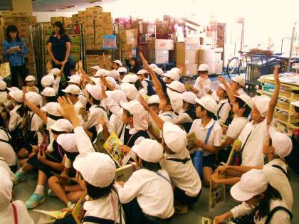多忙な時間帯にもかかわらず、店長さんはじめ従業員の方々に親切に倉庫の奥まで案内していただきました。また、児童の「利益率は何パーセントですか?」等の素朴な質問に対しても率直にお答えいただきました。お陰で、4時間目の教室でのまとめの学習では、見学してわかったことについて活発な意見が交わされて有意義な体験学習となりました。