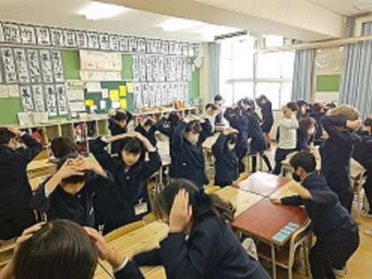 両手を頭に載せたら,スタート。先生が札を読みます。