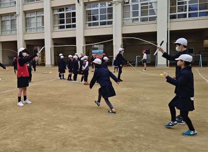 高学年の児童が低学年の児童になわに入るタイミングを教えるなど、仲良く活動できました。