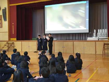 東中学校の生徒会執行部とESSの先輩に来てもらい、東中学校について紹介してもらったり、英語のクイズに答えたりしました。紹介動画を見た後、補足説明もしてもらいました。質問タイムでは、子どもたちからたくさんの質問が出され、丁寧に答えてもらいました。
