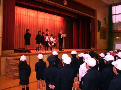 校長先生から、昨日瓦屋町グランドで開催された中央区民スポーツカーニバルで中大江の児童が大活躍していたことを讃えられ、町会対抗スウェーデンリレーで見事に優勝した男子チームに表彰状と記念メダルが手渡されました。