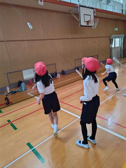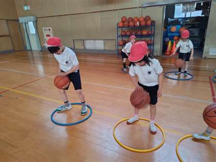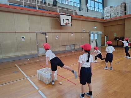 ロープを通したペットボトルやテニスボールを45度の角度で投げたり、フープの中でバスケットボールをついたり、(玉入れの)白玉を鬼の顔の的に当てたりと、いろんなアイテムを使い、楽しんで取り組みました。