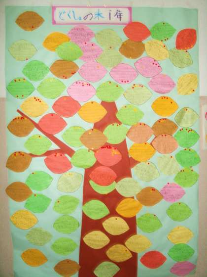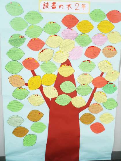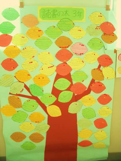 読書週間は先週で終了しました。その取組みには恒例の「読書の木」を作る活動もありました。「読書の木」は子どもたちが読んだ本の中でおすすめの本を、友達に紹介するために「葉っぱのカード」に感想を書いて大きな台紙に貼りつける活動です。