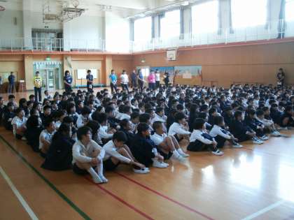 午前10時10分。不審者対応の防犯訓練が実施されました。東警察署から防犯係の警察官や区役所の職員が見守る中、校内に不審者が侵入したことを想定して、不審者の説得と校内放送、職員室と警察との連絡、各教室から講堂への児童の安全な避難誘導を行いました。講堂では、婦人警官より紙芝居を使って「一人で遊ばない」「知らない人の車には絶対に乗らない」などの5つの約束のお話がありました。