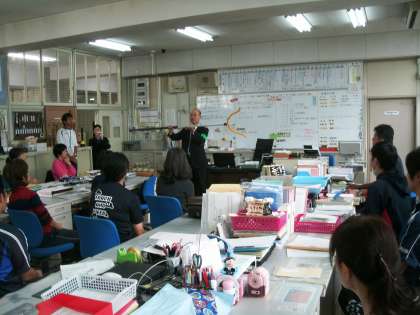 終了後は、職員室で警察署員より避難訓練の子どもたちの様子をほめていただいた後、さすまたの使い方についての指導がありました。