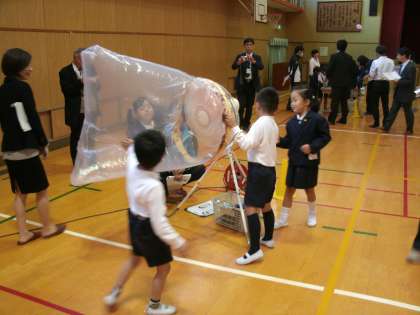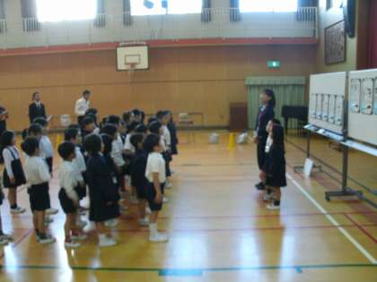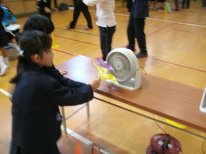 5時間目、1年2組の授業公開と研修会を行いました。大阪市教育委員会や大阪市内の先生方が熱心に参観される中、講堂で「はっけん!風パワー!の単元の授業を公開しました。風の強弱の見つけ方をドライヤーや送風機を使って子どもたちの考えた方法で確かめ合いました。