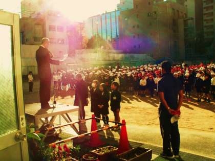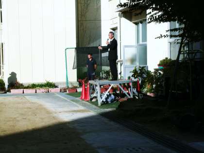 今朝の児童朝会。初めに、図画や書道の入賞者への表彰がありました。そして、校長先生からは今朝泣きながら登校してきた子も元気よくあいさつを交わしているうちにしだいに笑顔が戻ってうれしかったことや土曜日の作品展に向けて家族の人と話し合う機会を増やしていこうということについてのお話がありました。