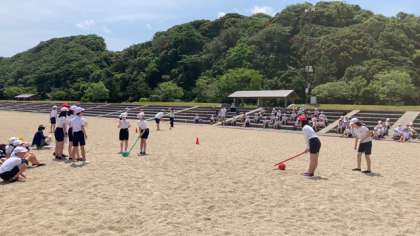 ボールをスイカに見立てたスイカ割りゲームです。友だちの指示をよく聞いて!