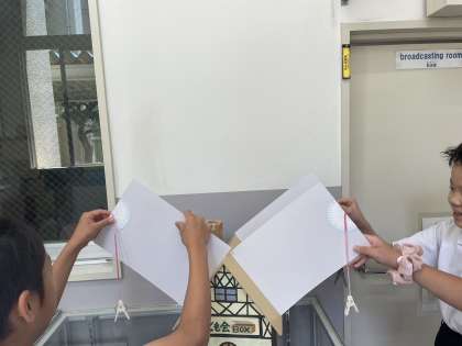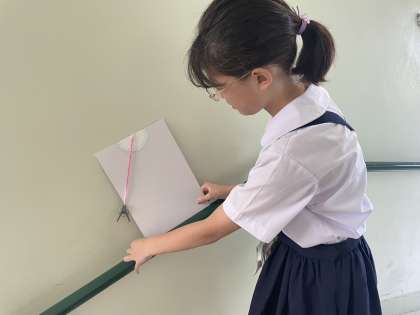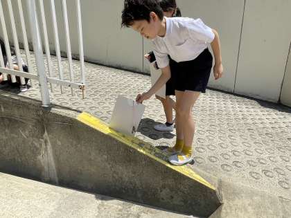 算数の時間に「かたむき分度器」を使って、学校内で斜めになっているところをはかる学習をしました。