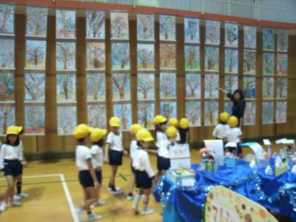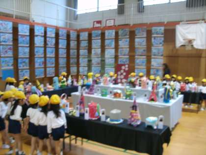 9時30分。中大江幼稚園の園児たちが、元気なあいさつの声とともに作品展を見学にやってきました。幼稚園でも土曜日の作品展に向けて準備中です。幼小交流の成果が発揮できることを期待しています。