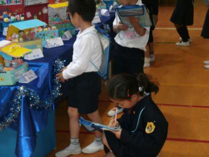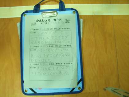 手には「かんしょうカード」。自分が気に入った作品が見つかれば作者の名前や良いところを考えて一生懸命に書いていました。ところがシートの枠は3人分しかありません。3人では足りず、紙の裏にまで書き込んでいる子も少なくありませんでした。