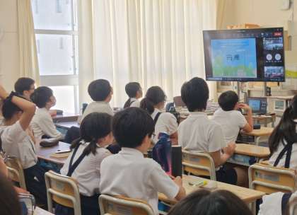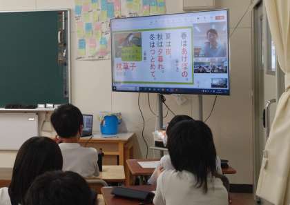 国語、理科、英語の3つのコースに分かれ、Teamsを活用して、玉造小、南大江小、開平小の6年生と共に学習に取り組みました。