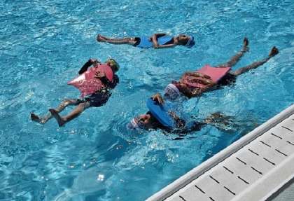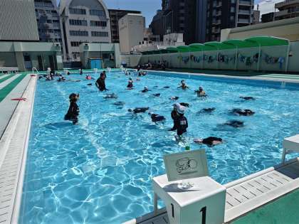 写真は,だるま浮きやラッコ浮き,こいのぼりのまけっこ遊びをしているところです。